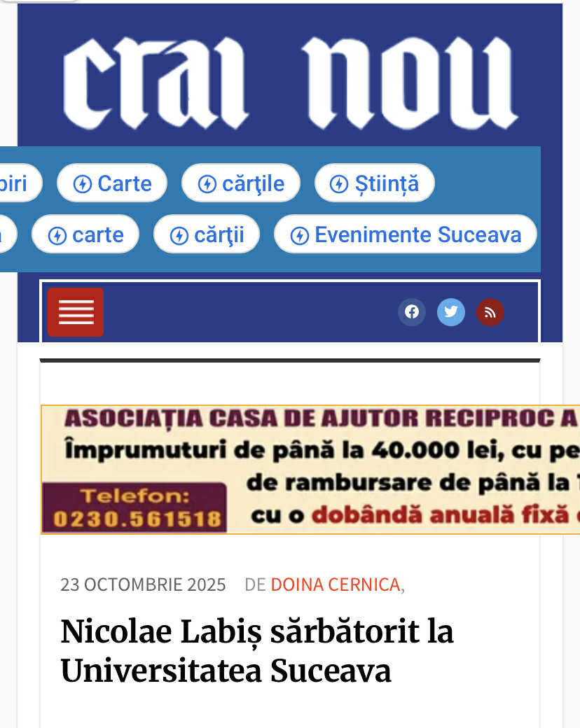 În paginile revistei Crai Nou din Suceava a fost publicat un amplu articol semnat de Doina Cernica, intitulat „Nicolae Labiş sărbătorit la Universitatea Suceava”, dedicat lansării volumului „Nicolae Labiș. Opere”, apărut la Editura Știința (Chișinău), în colecția „Moștenire”.
