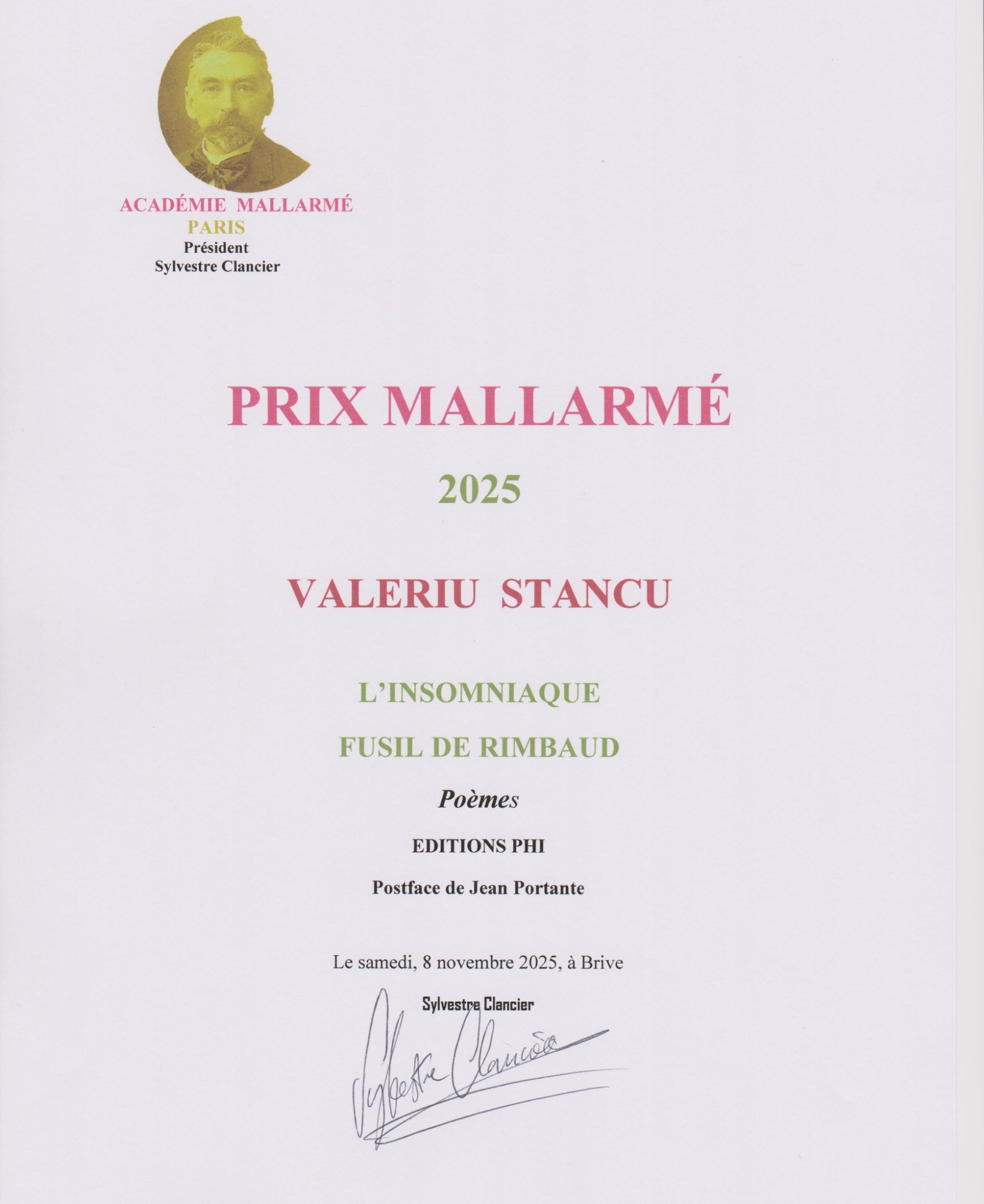 Vestea îmbucurătoare este că poetul și traducătorul Valeriu Stancu este laureatul din acest an (2025) al prestigiosului Premiu al Academiei Mallarmé (Le Prix Mallarmé).